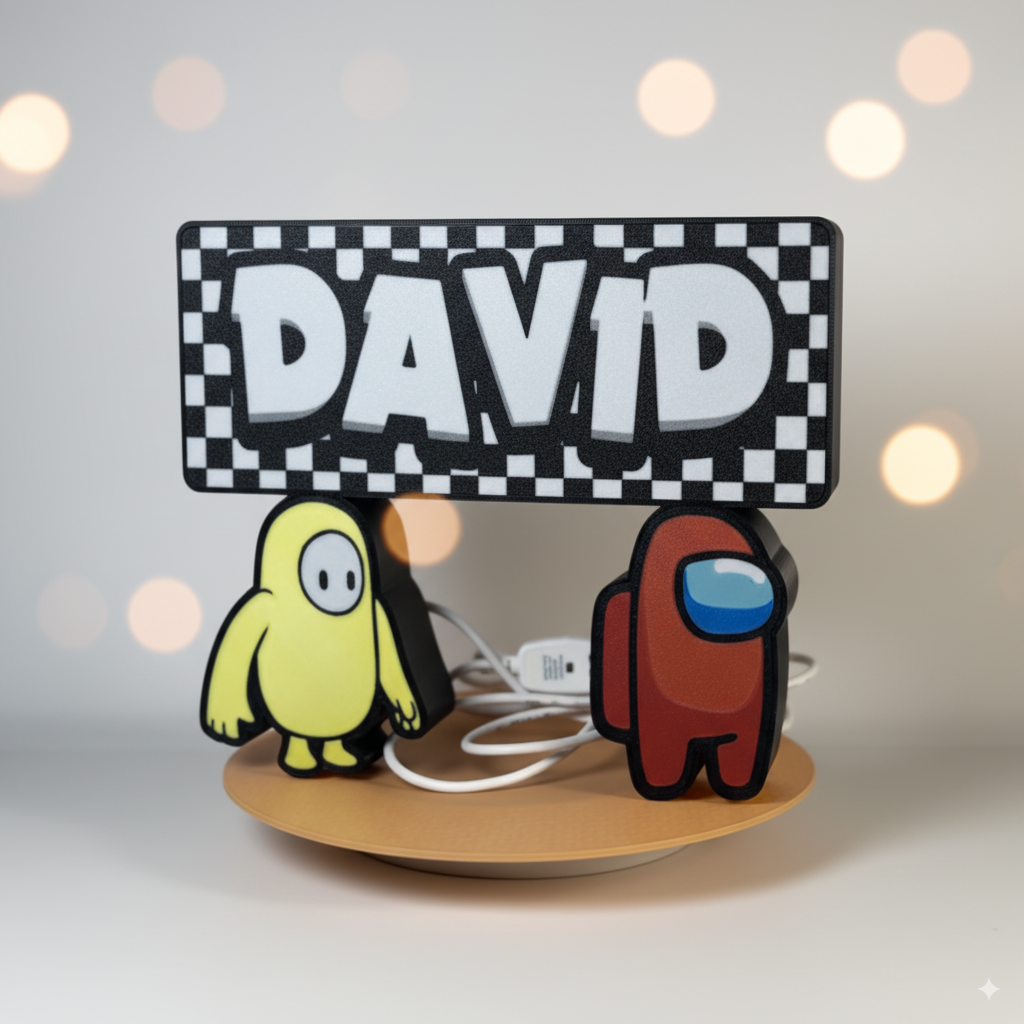 Una fusión perfecta entre luz, juego y personalidad. Esta lámpara combina el nombre “DAVID” en un marco tipo lightbox con borde ajedrezado, acompañado por dos figuras icónicas del mundo gamer: un personaje de Fall Guys y otro de Among Us. Cada elemento está impreso en 3D y cuenta con iluminación LED interna, creando una composición divertida, vibrante y única.